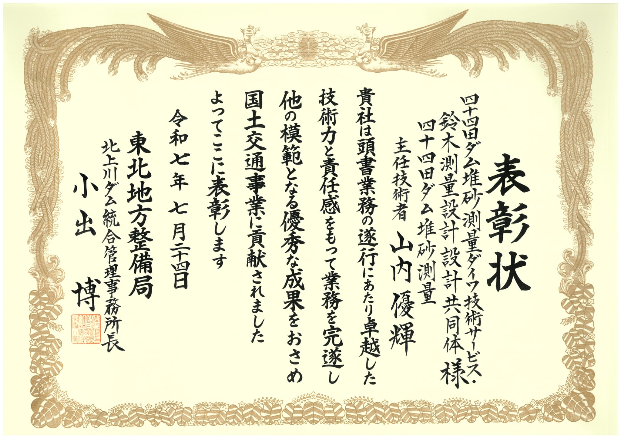国土交通省東北地方整備局北上川ダム統合管理事務所より表彰を受けました。 2025-07-25 04:16:00 UTC 令和6年度に、国土交通省東北地方整備局北上川ダム統合管理事務所において履行された業務を対象に、 卓越した技術力と責任感をもって業務を完遂し他の模範となる優秀な成果をおさめ国土交通事業に貢献したとして、 東北地方整備局北上川ダム統合管理事務所長より表彰を受けました。